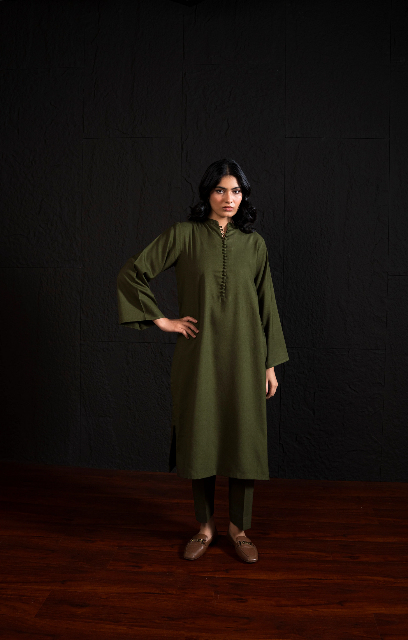 The Olive Co-ord redefines simplicity with its clean silhouette and graceful flow. Designed in an elegant olive hue, it features a longline fit, front button closure, and soft bell sleeves for subtle movement. A statement in minimalism — perfect for elevating everyday moments or refined occasions alike.